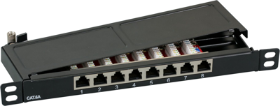 The high quality of the shielded Cat.6A RJ45 mini patch panel ensures excellent performance for 10 Gigabit Ethernet applications. The 10" patch panel offers a high port density with 8 ports at 0.5 U. In addition, the mini patch panel is characterized by its versatile mounting options.