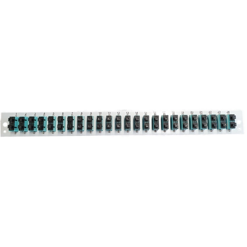 Front panel for 19" splice boxes equipped with SC duplex adapters in the categories OM3, OM4 and OS2.