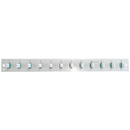 Front panel for 19" splice boxes equipped with LC duplex adapters in the categories OM3, OM4 and OS2.