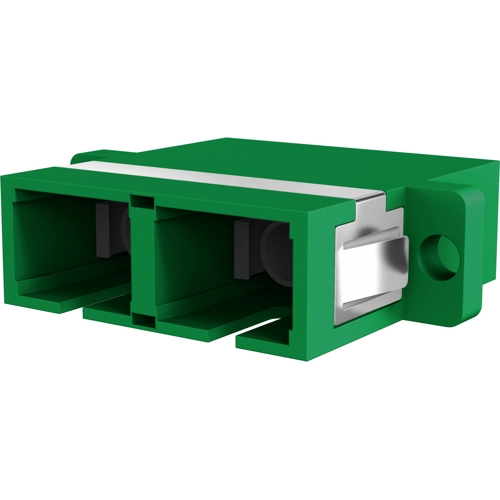 Adapter SC/APC Duplex SM one piece, green, ceramic sleeve, with plastic housing.