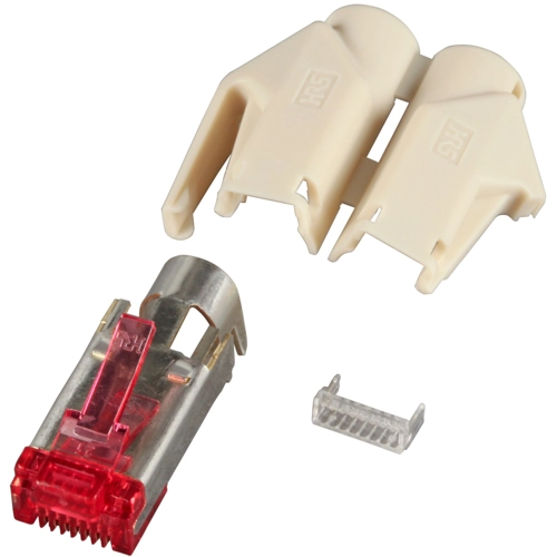 The H7641.1-50 is a RJ45 Hirose connector set for stranded wires. The set consists of RJ plug, anti-kink sleeve and guide plate.