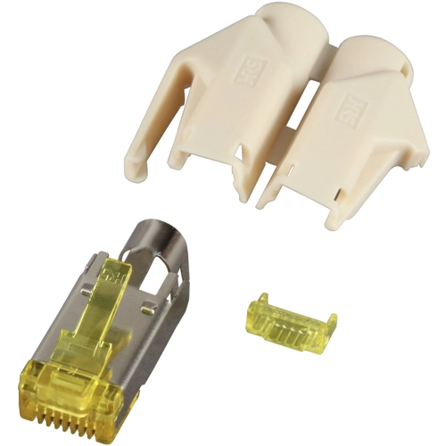 The H7642.1-50 is a RJ45 Hirose connector set for stranded wires. The set consists of RJ plug, anti-kink sleeve and guide plate.