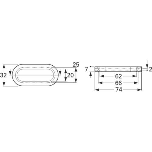 Technical attributes (type, cable entry B x C, dimensions (A, E, F, G, H)): 2427CA01, 32 x 62, A 74, E 66, F 25, G 7.0, H 2.0 mm