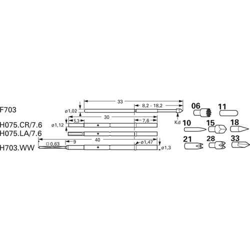 Technical attributes (type, plunger with tip design, tip diameter TD, material, finish (LG is long-life gold for particularly long endurance)): H075.CR/7.6, receptacle for probe F703, crimp terminals