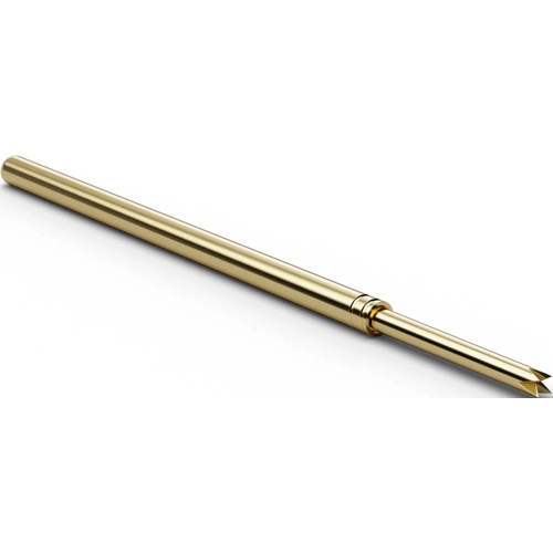 For assembled or bare PCBs, also suitable for SMD applications; Projecting height: 8.4 to 16 mm. Contact tolerance: ±0.08 mm. Operating temperatures: -20 to +80 °C. Maximum continuous current: 5.0 A. Typical contact resistance: 30 mohm. Barrel: gold-plated new silver. Receptacle: gold-plated new silver, typical contact resistance 30 mohm. Tip designs: 05 concave (cup), 06 serrated (honeycomb), 07 hexagonal (fluted star) 90°, 10 flexible needle, 11 round shaft, 12 round shaft, 14 four-point crown head (self-cleaning), 15 triangular head (pyramid), 18 conical shaft (spear) 30°, 20 four-point crown head with faces, 21 four-point crown head, 33 lance shaft (dagger) 38°, 34 rigid needle head 15°, 36 seven-point crown tulip with lead central point, 37 four-point crown head with faces, 38 lance shaft (dagger) 90°, 43 lance shaft (dagger) 90°, 64 miniature serrated head (honeycomb).