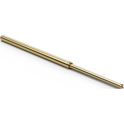 Primarily for use on loaded PCBs (SMD as well). Often used in combination with pin F585 for two-stage adaptations. The receptacle with press-ring is the same as used with F585 and allows custom projection heights; Projecting height: 14.1 to 21.7 mm. Contact tolerance: ±0.1 mm. Operating temperatures: -20 to +80 °C. Maximum continuous current: 5.0 A. Typical contact resistance: 25 mohm. Barrel: gold-plated new silver. Spring: spring steel, gold-plated. Receptacle: gold-plated new silver. Tip designs: 05 concave (cup), 06 serrated (honeycomb), 15 triangular head (pyramid), 18 conical shaft (spear) 30°, 21 four-point crown head (self-cleaning), 28 four-point crown head, 33 lance shaft (dagger).