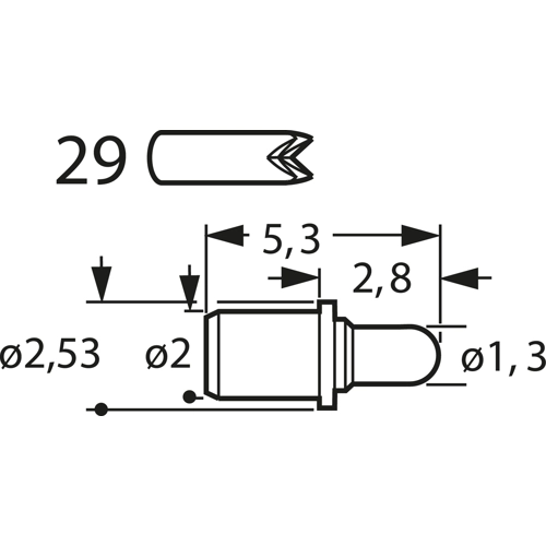 For restricted assembly heights; Projecting height: 3.0 mm. Maximum spring travel: 1.2 mm. Recommended spring travel: 1.0 mm. Prestress: 20 cN. Spring force at recommended spring travel: 200 cN ±20 %. Contact tolerance: ±0.08 mm. Operating temperatures: -20 to +80 °C. Maximum continuous current: 5.0 A. Typical contact resistance: 20 mohm. Barrel: gold-plated brass. Spring: silver-plated spring steel. Receptacle: gold-plated bronze. Tip designs: 11 round shaft, 29 four-point crown head.