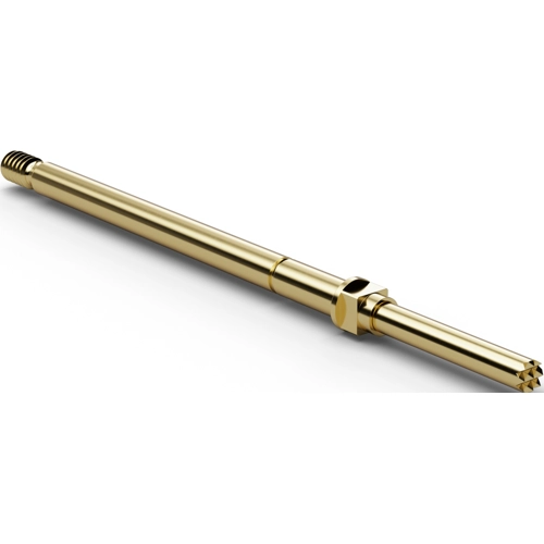Derivative of F772, screwed to receptacle H732LARD to prevent the probe from leaving its position. The receptacle is sealed completely after the wire has been soldered on; Projection height: 10.5 mm. Maximum spring travel: 5.0 mm. Recommended spring travel: 4.0 mm. Prestress: 60 cN. Contact tolerance: ±0.08 mm. Operating temperatures: -20 to +80 °C. Maximum continuous current: 5.0 A. Typical contact resistance: 25 mohm. Barrel: gold-plated brass. Spring: silver-plated spring steel. Receptacle: gold-plated brass. Tip designs: 05 concave (cup), 06 serrated (honeycomb), 07 hexagonal 90° (fluted star), 11 round shaft, 12 rounded head (bullet nose), 14 four-point crown head (self-cleaning), 15 triangular head (pyramid), 16 flat shaft, 17 flat head, 18 conical shaft 30° (spear).