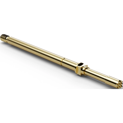 Derivative of F772, screwed to receptacle H732LARD to prevent the probe from leaving its position. The receptacle is sealed completely after the wire has been soldered on; Projection height: 10.5 mm. Maximum spring travel: 5.0 mm. Recommended spring travel: 4.0 mm. Prestress: 60 cN. Contact tolerance: ±0.08 mm. Operating temperatures: -20 to +80 °C. Maximum continuous current: 5.0 A. Typical contact resistance: 25 mohm. Barrel: gold-plated brass. Spring: silver-plated spring steel. Receptacle: gold-plated brass. Tip designs: 05 concave (cup), 06 serrated (honeycomb), 07 hexagonal 90° (fluted star), 11 round shaft, 12 rounded head (bullet nose), 14 four-point crown head (self-cleaning), 15 triangular head (pyramid), 16 flat shaft, 17 flat head, 18 conical shaft 30° (spear).