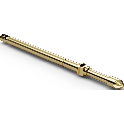 Derivative of F772, screwed to receptacle H732LARD to prevent the probe from leaving its position. The receptacle is sealed completely after the wire has been soldered on; Projection height: 10.5 mm. Maximum spring travel: 5.0 mm. Recommended spring travel: 4.0 mm. Prestress: 60 cN. Contact tolerance: ±0.08 mm. Operating temperatures: -20 to +80 °C. Maximum continuous current: 5.0 A. Typical contact resistance: 25 mohm. Barrel: gold-plated brass. Spring: silver-plated spring steel. Receptacle: gold-plated brass. Tip designs: 05 concave (cup), 06 serrated (honeycomb), 07 hexagonal 90° (fluted star), 11 round shaft, 12 rounded head (bullet nose), 14 four-point crown head (self-cleaning), 15 triangular head (pyramid), 16 flat shaft, 17 flat head, 18 conical shaft 30° (spear).