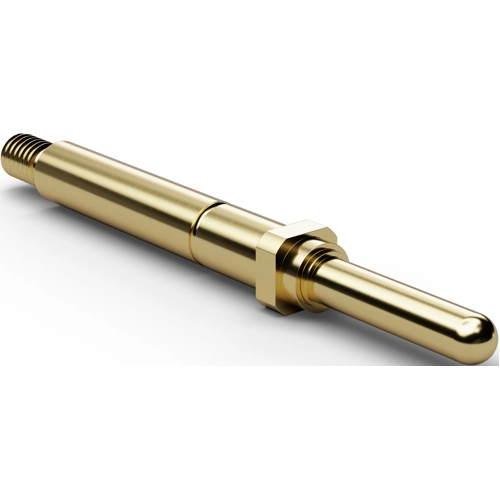 Derivative of F773, screwed to receptacle H733LARD to prevent the pin from leaving its position. The receptacle is sealed completely after the wire has been soldered on; Projection height: 10.5 mm. Maximum spring travel: 5.0 mm. Recommended spring travel: 4.0 mm. Prestress: 50 cN. Contact tolerance: ±0.1 mm. Operating temperatures: -20 to +80 °C. Maximum continuous current: 10 A. Typical contact resistance: 25 mohm. Barrel: gold-plated brass. Spring: silver-plated spring steel. Receptacle: gold-plated brass. Tip designs: 05 concave (cup), 06 serrated (honeycomb), 11 round shaft, 12 round head (bullet nose), 15 triangular head (pyramid), 16 flat shaft, 17 flat head, 18 conical shat 30° (spear), 39 conical shaft 30° with flat tip.
