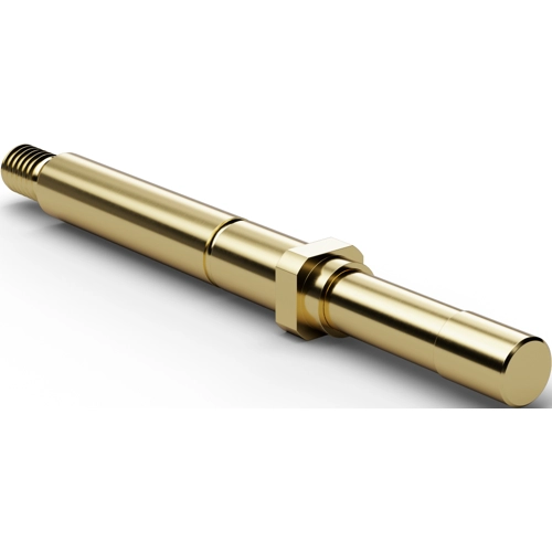 Derivative of F773, screwed to receptacle H733LARD to prevent the pin from leaving its position. The receptacle is sealed completely after the wire has been soldered on; Projection height: 10.5 mm. Maximum spring travel: 5.0 mm. Recommended spring travel: 4.0 mm. Prestress: 50 cN. Contact tolerance: ±0.1 mm. Operating temperatures: -20 to +80 °C. Maximum continuous current: 10 A. Typical contact resistance: 25 mohm. Barrel: gold-plated brass. Spring: silver-plated spring steel. Receptacle: gold-plated brass. Tip designs: 05 concave (cup), 06 serrated (honeycomb), 11 round shaft, 12 round head (bullet nose), 15 triangular head (pyramid), 16 flat shaft, 17 flat head, 18 conical shat 30° (spear), 39 conical shaft 30° with flat tip.