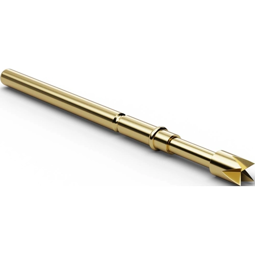For use with two-stage adapters. The H772 receptacle allows a variable and the H712 receptacle a fixed projection height of 10 mm; Projection height: 10 to 17.6 mm. Maximum spring travel: 5.0 mm. Recommended spring travel: 4.0 mm. Prestress: 60 cN. Contact tolerance: ±0.08 mm. Operating temperatures: -20 to +80 °C. Maximum continuous current: 5.0 A. Typical contact resistance: 25 mohm. Barrel: gold-plated new silver. Spring: silver-plated spring steel. Receptacle: new silver, gold plated. Tip designs: 05 concave (cup), 06 serrated (honeycomb), 07 hexagonal 90° (fluted star), 11 round shaft, 14 four-point crown head (self-cleaning), 15 triangular head (pyramid), 17 flat head, 18 conical shaft 30° (spear), 21 four-point crown head.