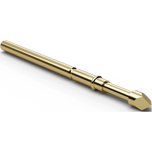 For use with two-stage adapters. The H772 receptacle allows a variable and the H712 receptacle a fixed projection height of 10 mm; Projection height: 10 to 17.6 mm. Maximum spring travel: 5.0 mm. Recommended spring travel: 4.0 mm. Prestress: 60 cN. Contact tolerance: ±0.08 mm. Operating temperatures: -20 to +80 °C. Maximum continuous current: 5.0 A. Typical contact resistance: 25 mohm. Barrel: gold-plated new silver. Spring: silver-plated spring steel. Receptacle: new silver, gold plated. Tip designs: 05 concave (cup), 06 serrated (honeycomb), 07 hexagonal 90° (fluted star), 11 round shaft, 14 four-point crown head (self-cleaning), 15 triangular head (pyramid), 17 flat head, 18 conical shaft 30° (spear), 21 four-point crown head.
