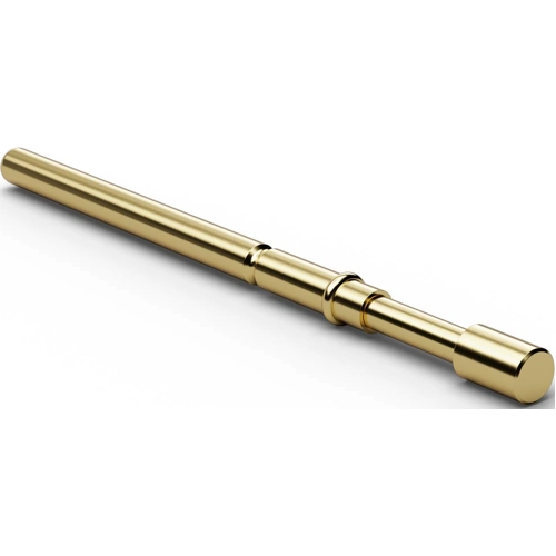 For use with two-stage adapters. The H772 receptacle allows a variable and the H712 receptacle a fixed projection height of 10 mm; Projection height: 10 to 17.6 mm. Maximum spring travel: 5.0 mm. Recommended spring travel: 4.0 mm. Prestress: 60 cN. Contact tolerance: ±0.08 mm. Operating temperatures: -20 to +80 °C. Maximum continuous current: 5.0 A. Typical contact resistance: 25 mohm. Barrel: gold-plated new silver. Spring: silver-plated spring steel. Receptacle: new silver, gold plated. Tip designs: 05 concave (cup), 06 serrated (honeycomb), 07 hexagonal 90° (fluted star), 11 round shaft, 14 four-point crown head (self-cleaning), 15 triangular head (pyramid), 17 flat head, 18 conical shaft 30° (spear), 21 four-point crown head.