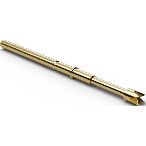 Used in combination with F772 for two-stage fixtures. The H772 receptacle allows a variable and the H712 receptacle a fixed projection height of 16 mm; Projection height: 16 to 23.6 mm. Maximum spring travel: 8.0 mm. Recommended spring travel: 6.4 mm. Prestress: 60 cN. Contact tolerance: ±0.1 mm. Operating temperatures: -20 to +80 °C. Maximum continuous current: 5.0 A. Typical contact resistance: 25 mohm. Barrel: new silver, gold plated. Spring: silver-plated spring steel. Receptacle: new silver, gold plated. Tip designs: 06 serrated (honeycomb), 07 hexagonal (fluted star) 90°, 14 4-point crown head (self-cleaning), 15 triangular head (pyramid), 18 conical shaft 30° (spear), 32 rigid needle shaft 10°, 33 lance shaft (dagger- four-sided), 34 rigid needle head 15°.