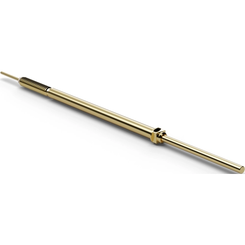 Can be combined with different receptacles. Variable projection height; Maximum spring travel: 5.0 mm. Recommended spring travel: 4.0 mm. Pointing precision: ±0.08 mm. Switch travel: 1.5 mm ±0.2 mm. Operating temperatures: -20 to +80 °C. Maximum switched current: 1.0 A. Typical contact resistance: 65 mohm. Dimension L: 50.6 mm (type F875 = 57.1 mm). Barrel: gold-plated brass. Spring: silver-plated spring steel. Receptacle: gold-plated brass. Tip designs: 05 concave (cup), 06 serrated (honeycomb), 11 round shaft, 16 flat shaft, 17 flat head.