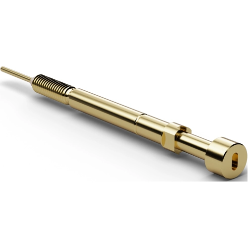 Larger tip diameter compared to F885. F886 with spring travel reduction compared to F885 by 0.8 mm due to its lock pin (anti-twist device for mounting); Maximum spring travel: 4.2 mm. Recommended spring travel: 4.0 mm. Prestress: 80 cN. Contact tolerance: ±0.09 mm, switch travel: 1.7 mm ±0.2 mm. Operating temperatures: -20 to +80 °C. Maximum switched current: 1.0 A. Typical contact resistance: 50 mohm. Dimension L: type SM = 44.8 mm, type LM = 51.3 mm. Barrel: gold-plated brass. Spring: silver-plated spring steel. Receptacle: gold-plated brass. Tip designs: 06 serrated (honeycomb), 17 shouldered flat probe.