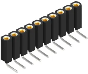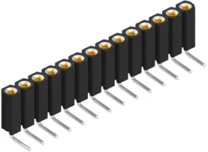 Straight solder pins with 2.54 mm grid, splittable, single-row and double-row, precision contacts for 0.55 x 0.55 to 0.65 x 0.65 mm square pins and round pins with diameters from 0.65 to 0.85, for soldering into PCBs; Rated current: 3.0 A. Rated voltage: 100 VAC/150 VDC. Test voltage: 1500 V. Capacitance between two adjacent contacts: max. 0.3 pF. Insulator: PA 4.6, glass fiber-reinforced. Inflammability class: UL 94 V-0. Insulation resistance: min. 1000 Gohm. Contacts: brass contact body, 6.0 µm tinned nickel primer. Contact spring: beryllium copper, 0.75 µm gold-plating on nickel primer. Contact resistance: max. 10 mohm. Shock strength: 50 g. Vibration resistance: 15 g. Cohesion: insertion/removal min. 1.27/0.3 N/m. Operating temperatures: –40 to +163 °C (1 min. +260 °C).