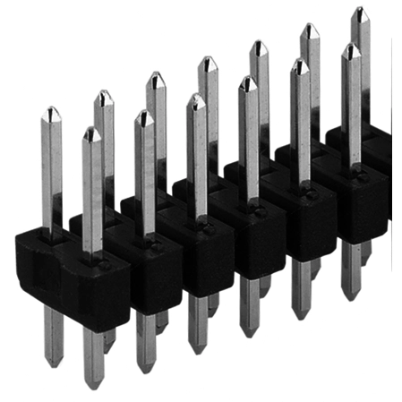 With 2.54 mm grid, interruptible, single-row or dual-row, with 0.635 x 0.635 mm square pins. For soldering into PCBs; Rated current: 3.0 A. Rated voltage: 250 VAC. Test voltage: 2000 V. Insulator: PA 4.6 GV. Inflammability class: UL 94 V-0. Insulation resistance: at least 1000 Gohm. Contacts: phosphor bronze, 0.2 mu gold-plated on nickel primer or selective gold-plated, respectively 6.0 µm tinned. Contact resistance: max. 5.0 mohm. Holding force: at least 7.0 N. Operating temperatures: –40 to +163 °C (+260 °C for 1 minute).
