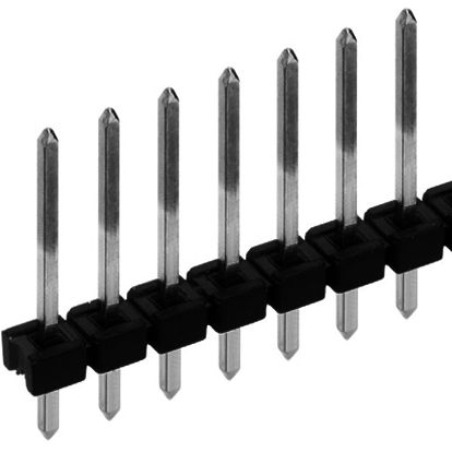 2.54 mm grid, interruptible, single and dual row, with 0.635 x 0.635 mm square pins, for soldering into PCBs; Rated current: 3.0 A. Rated voltage: 250 VAC. Test voltage: 2000 V. Isolator PA 4.6 GF. Insulation resistance: at least 1000 Gohm. Contact material: CuSn alloy. Contact finish: 0.2 µm Au or 6.0 µm tin on nickel primer. Contact resistance: max. 5.0 mohm, for solder bath up to +260 °C (1.0 min.). Operating temperatures: –40 to +163 °C. Solder pin length (B): 3.0 mm.