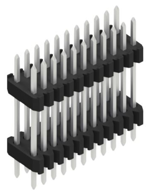 Sandwich pin header, two rows, 0.4 mm, for connecting overlapping PCBs, pitch 1.27 x 1.27 mm.