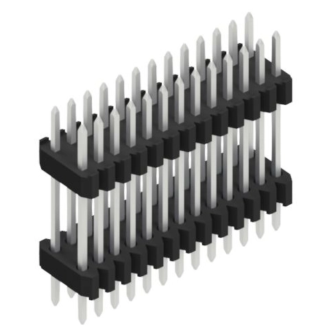Sandwich pin header, two rows, 0.4 mm, for connecting overlapping PCBs, pitch 1.27 x 1.27 mm.