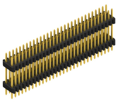 Sandwich pin header, two rows, 0.4 mm, for connecting overlapping PCBs, pitch 1.27 x 1.27 mm.