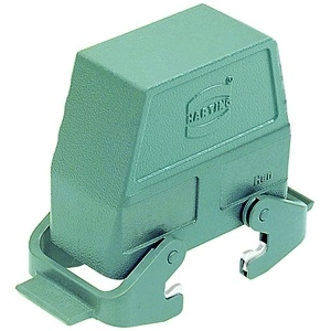 Hood with double locking lever and side entry, material: aluminium die-cast, powder-coated.