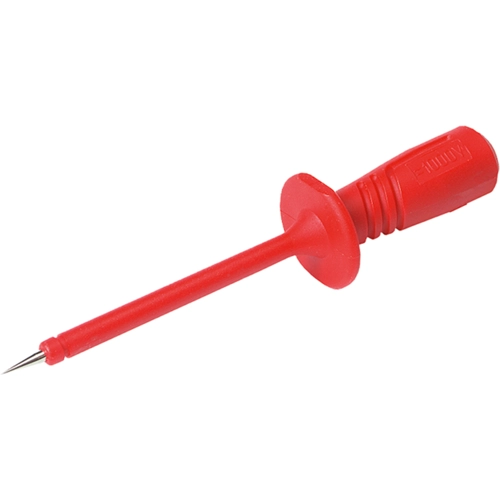 Compliant with IEC 61010. With elastic, step-on proof insulating sleeve and 2.0 mm stainless steel tip; Connection: 4.0 mm jack made of brass. Rated voltage: 1000 V AC/DC, CAT III. Contact resistance: 50 mohm. Operating temperatures: –25 to +80 °C.