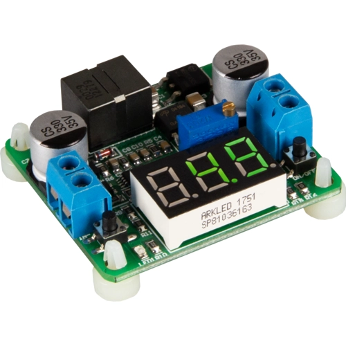 The freely configurable voltage converter module is equipped with a "Step UP" and a "Step DOWN" function. The voltage is individually adjustable by a trimmer and is shown on the integrated segment display. The maximum power is 25 W / 2 A.