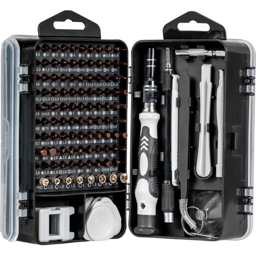 This high-quality, 115-piece tool set contains all the tools needed to repair fine electronic devices such as smartphones and game consoles. In addition to a total of 98 bits made of high-quality S2 tool steel, the set includes tools for safe opening, gripping and levering. The entire set is packed in a clear plastic storage box, which can also be used to sort screws during use.