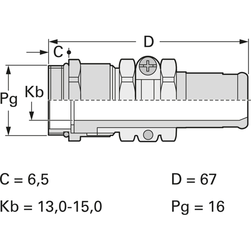 Technical attributes (type, Pg size, cable clamping range, dimensions (C/D)): 52001070, Pg 16, 13 to 15 mm, C 6.5/D 67 mm
