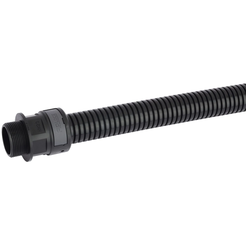 The 61804233 is a hose fitting, with a metric connection thread, made of specially modified, zero-halogen polyamide 6 is self-extinguishing and resistant against most chemical media commonly used. Due to its excellent UV-resistance, this product is also perfectly suited for outdoor installations.