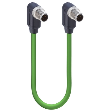 Fast Ethernet Cat5e Data double-ended cordset: Male angled D-coded black M12 Standard to male angled D-coded black M12 Standard, shielded, 50 V AC / 60 V DC, 4 A; PUR green cable, 4-wires, 2x2x0.34 mm².