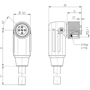 M12 Standard Actuator/sensor single-ended cordset: Female, angled, 4-pin, A-coded, shielded, orange body, 50 V AC / 60 V DC, 4 A; PUR black cable, 4-wires, 0.34 mm².