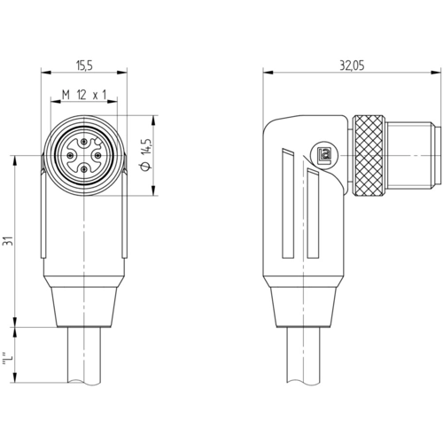 M12 Standard Actuator/sensor single-ended cordset: Male, angled, 4-pin, A-coded, shielded, orange body, 50 V AC / 60 V DC, 4 A; PUR black cable, 4-wires, 0.34 mm².