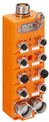 Profibus-DP device with 8 digital inputs to connect standard sensors and 4 digital outputs to connect standard actuators, combined M12 socket, rotary switches for addressing, M23 bus connection, M23 actuator supply.