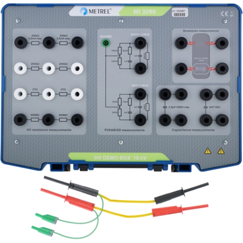 The MI 3299 10 kV high voltage demonstration box is designed for demonstration purposes in high voltage insulation diagnostics. It simulates typical electrical insulation commonly found in industrial environments. It is equipped with high quality resistors in different ranges, high voltage capacitors and a discharge device to simulate a breakdown phenomenon in gases. In addition, measurements of polarization index (PI), dielectric discharge (DD) and dielectric absorption ratio (DAR) can be demonstrated. Equipped with all these functions, the demonstration box is also well suited for basic calibration of DC high-voltage insulation resistance meters.