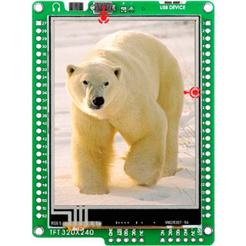 The mikromedia for PIC24EP® is a compact development system with lots of on-board peripherals which allow development of devices with multimedia contents. The central part of the system is a 16-bit PIC24EP512GU810 microcontroller. The mikromedia for PIC24EP® features integrated modules such as stereo MP3 codec, TFT 320x240 touch screen display, accelerometer, USB connector, audio connector, MMC/SD card slot, 8 Mbit flash memory, 2x26 connection pads and other. It comes pre-programmed with USB HID bootloader, but can also be programmed with external programmers, such as mikroProg™ or ICD2/3.
