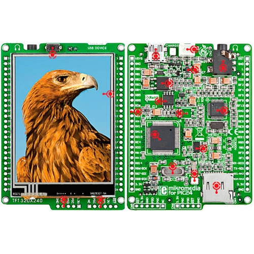 Display size: 2.8",Resolution: 320x240px,MCU: PIC24FJ256GB110,MCU speed: 16 MIPS,MCU Memory: 256 KB of Flash, 16384 bytes of RAM,Graphic controller: ILI9341,Touch Screen: Resistive,Storage: 8 Mbit Serial Flash, microSD card slot,Peripherals include: USB connector, Accelerometer, Battery Charger,Integration: Mounting holes,Power Supply: 5V (via USB),Applications: Best used as a development board but also as a final product. Use cases include industrial, medical, automotive and other dashboards and equipment.,Programming: Preprogrammed with fast USB HID bootloader. Also features mikroProg for PIC, dsPIC and PIC32 connector.,Expandability: Two 1x26 headers, mikromedia standard pinout,Architecture: dsPIC/PIC24 (16-bit),Displays: TFT full-color,Sound and Audio: VS1053 MPEG audio decoder