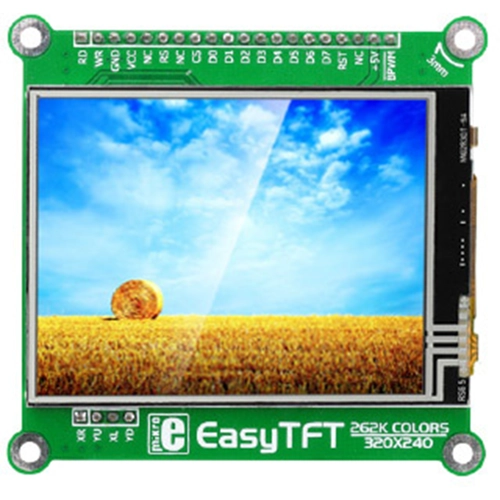 EasyTFT board is a perfect choice for users or mikroElektronika boards who want to upgrade their GLCD with TFT display. It features connector compatible with GLCD 128x64 connectors, as well as touch panel connectors. Board also contains TFT Color Display MI0283QT-9A with 320x240px resolution, which is driven by ILI9341 display controller, capable of showing advanced graphical content. It also features a Touch Screen and therefore can be used as input device. Board contains mounting holes for easier integration into your designs.