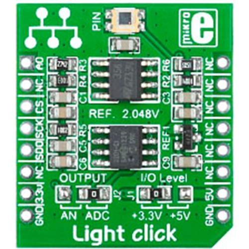 Interface: SPI,Power Supply: 3.3V or 5V,On-board modules: TSL230BR programmable light-to-frequency converter,Applications: Board is suitable for high-resolution conversion of light intensity to frequency with no external components. It has programmable sensitivity and full-scale output frequency,Key Features: Temperature compensation for the ultraviolet-to-visible light range of 320 nm to 700 nm and respond over the light range of 320 nm to 1050 nm,Key Benefits: All inputs and the output are TTL compatible,Compatibility: mikroBUS,Product Type: Optical,Click board size: S (28.6 x 25.4 mm)