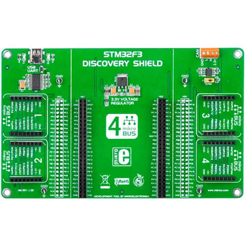 Interface: UART, USB,Power Supply: 5V (via USB),On-board modules: Four mikroBUS host sockets, USB-UART module and CAN transceiver,Applications: STM32F3 Discovery Shield allows you to use click additional boards from MikroElektronika on your STM32F3 Discovery,Key Features: On-board USB-UART module (FT232RL) and CAN transceiver (SN65HVD230),Key Benefits: Screw holes in corners simplify integration. A perfect workstation for your Discovery projects,Compatibility: Discovery,Product Type: Shield
