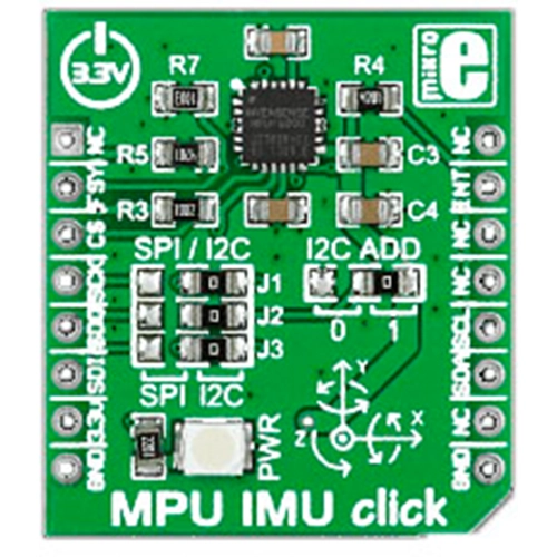Interface: I2C or SPI,Power Supply: 3.3V,On-board modules: MPU-6000 integrated 6-axis motion tracking device that combines a 3-axis gyroscope, a 3-axis accelerometer, and a DMP (Digital Motion Processor),Applications: This board is ideal for adding motion tracking functionalities to your device. Applications include 3-D remote controls, motion based game controllers, wearable fitness and sports gadgets, toys etc.,Key Features: DMT supports 3D MotionProcessing and gesture recognition algorithms,Key Benefits: User programmable gyroscope and accelerometer,Compatibility: mikroBUS,Product Type: Motion,Click board size: S (28.6 x 25.4 mm)
