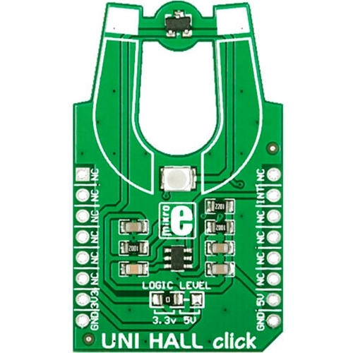 Interface: GPIO,Power Supply: 3.3V or 5V,On-board modules: Melexis US5881 unipolar Hall-effect switch and a 74LVC1T45 single bit, dual supply translating transceiver,Applications: Contactless proximity switch, Liquid level detector and alarm (with a magnet attached to a float), speedometor (inferred from RPM of a rotating wheel) and so on,Key Features: Hysteresis prevents output oscillation near switching point,Key Benefits: Hall switches are rugged, resistant to dirt and other contaminants,Compatibility: mikroBUS,Product Type: Hall effect,Click board size: M (42.9 x 25.4 mm)