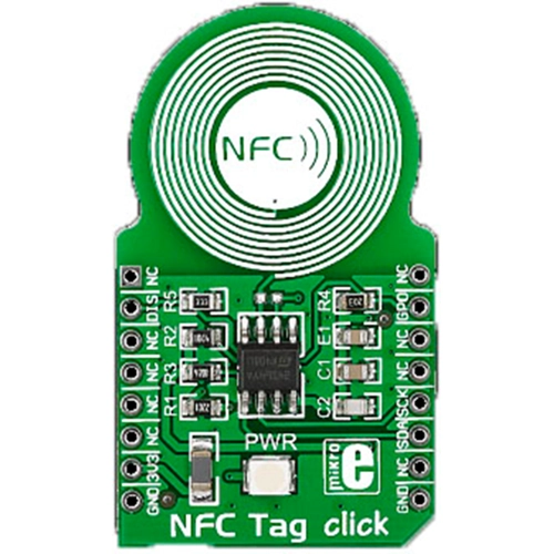Interface: I2C,Power Supply: 3.3V,On-board modules: M24SR64 NFC/RFID tag IC,Applications: The short range of NFC makes it an ideal standard for developing mobile payment systems (for example charging fare in public transport), or for any other short-range wireless data exchange,Key Features: Compatible with ISO/IEC 14443 Type A and NFC Forum Type 4 Tag. Supports NFC data exchange format (NDEF). Range of 3 cm,Key Benefits: 128-bit Password protection schemedevelopment time. 8KB of high reliability EEPROM,Compatibility: mikroBUS,Product Type: RFid/NFC,Click board size: M (42.9 x 25.4 mm)