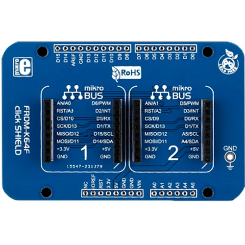 Power Supply: 3.3V or 5V,On-board modules: two mikroBUS™ host sockets,Applications: FRDM-K64F click shield allows you to use click add-on boards from MikroElektronika on Freescale’s FRDM-KL64Z development platform,Key Features: GND pin for oscilloscope probe,Key Benefits: Brings click board connectivity to Freescale’s Kinetis K64, K63, and K24 MCUs,Compatibility: Freedom,Product Type: Shield