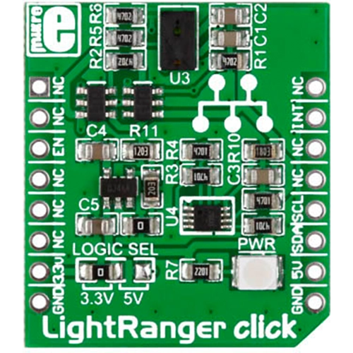 Interface: I2C,Power Supply: 3.3V or 5V,On-board modules: ST’s VL6180X IC,Applications: Proximity sensing for portable touchscreen devices (smartphones, tablets, gaming devices); Distance measurement in other applications. Also works as an ambient light sensor,Key Features: Sensor consists of IR emitter, ambient light sensor and range sensor. Measures distance by calculating photon time of flight,Key Benefits: Equally sensitive to all objects regardless of color and reflectivity,Compatibility: mikroBUS,Product Type: Proximity,Click board size: S (28.6 x 25.4 mm)