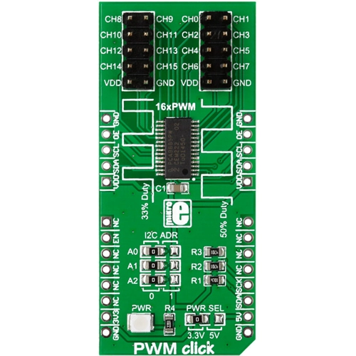Interface: I2C,Power Supply: 3.3V or 5V,On-board modules: PCA9685PW IC,Applications: Control 16 PWM outputs (or up to 112 if multiple PWM clicks are connected) through a single I2C interface. Ideal for robots, LED drivers, servo motors etc.,Key Features: Additional pinout for connecting multiple PWM clicks together,Key Benefits: 16 PWM outputs. Selectable I2C addresses,Compatibility: mikroBUS,Product Type: PWM,Click board size: L (57.15 x 25.4 mm)